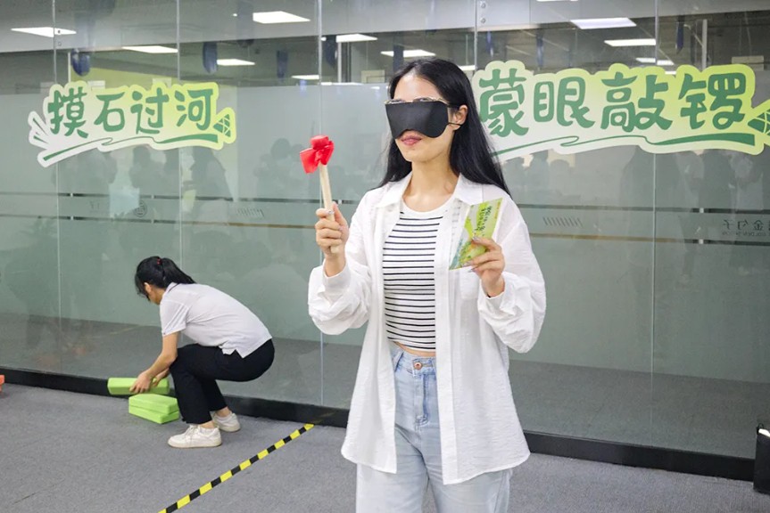 《蒙眼敲鑼》游戲中,參與者需在蒙眼的情況下,憑感覺找到鑼的位置并敲響。這一游戲讓員工們體驗到了信任與默契的重要性。